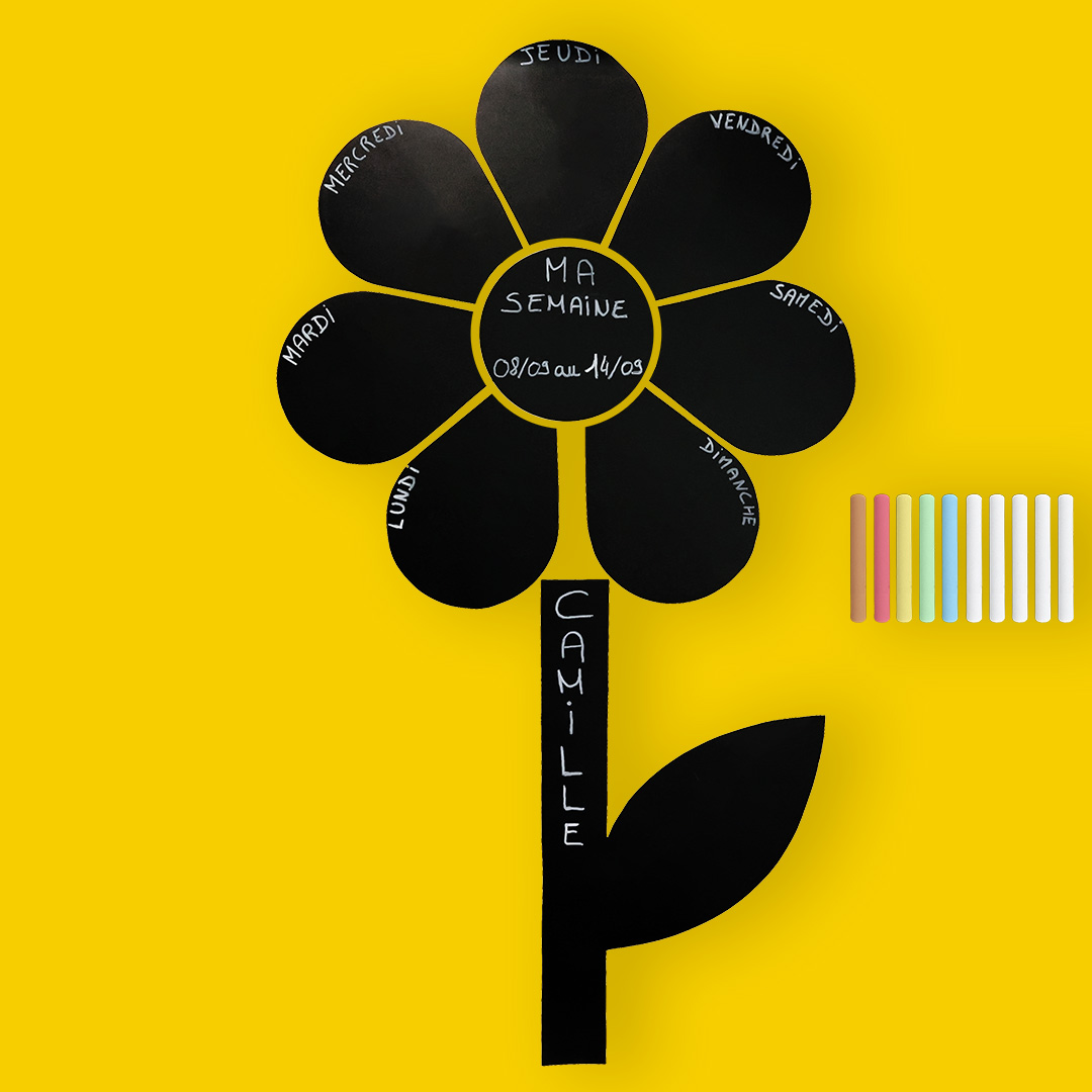 - J’inscris les jours de la semaine sur chaque pétale avec les craies fournies, j’ajoute “MA SEMAINE” et la date au centre de la fleur, enfin je personnalise la tige avec mon prénom.