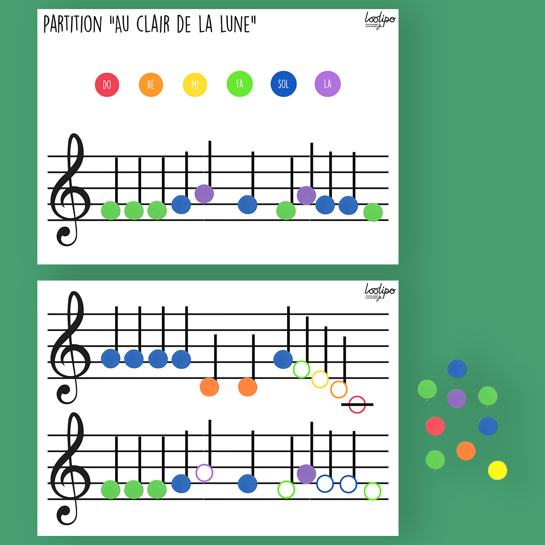 - Je place les gommettes sur chaque note indiquée sur la partition.