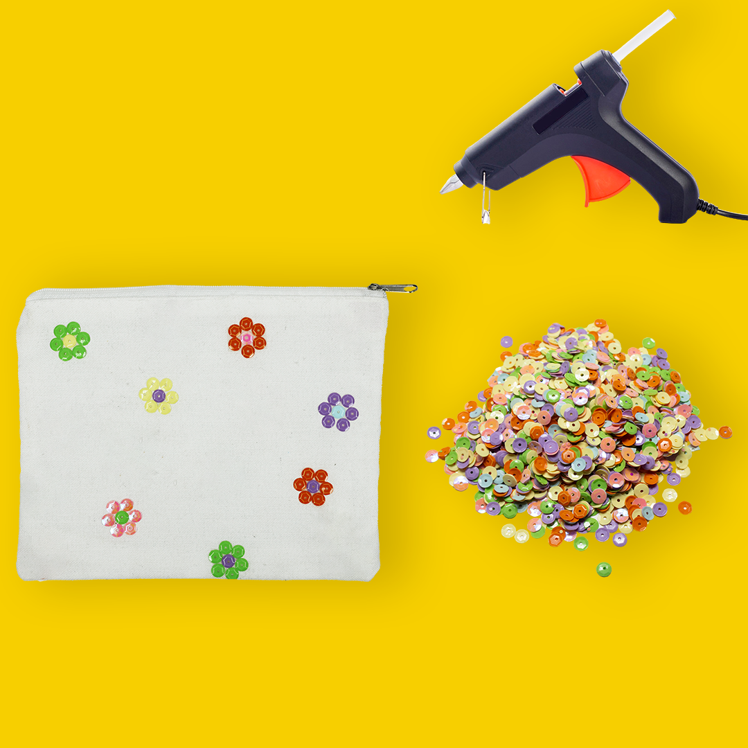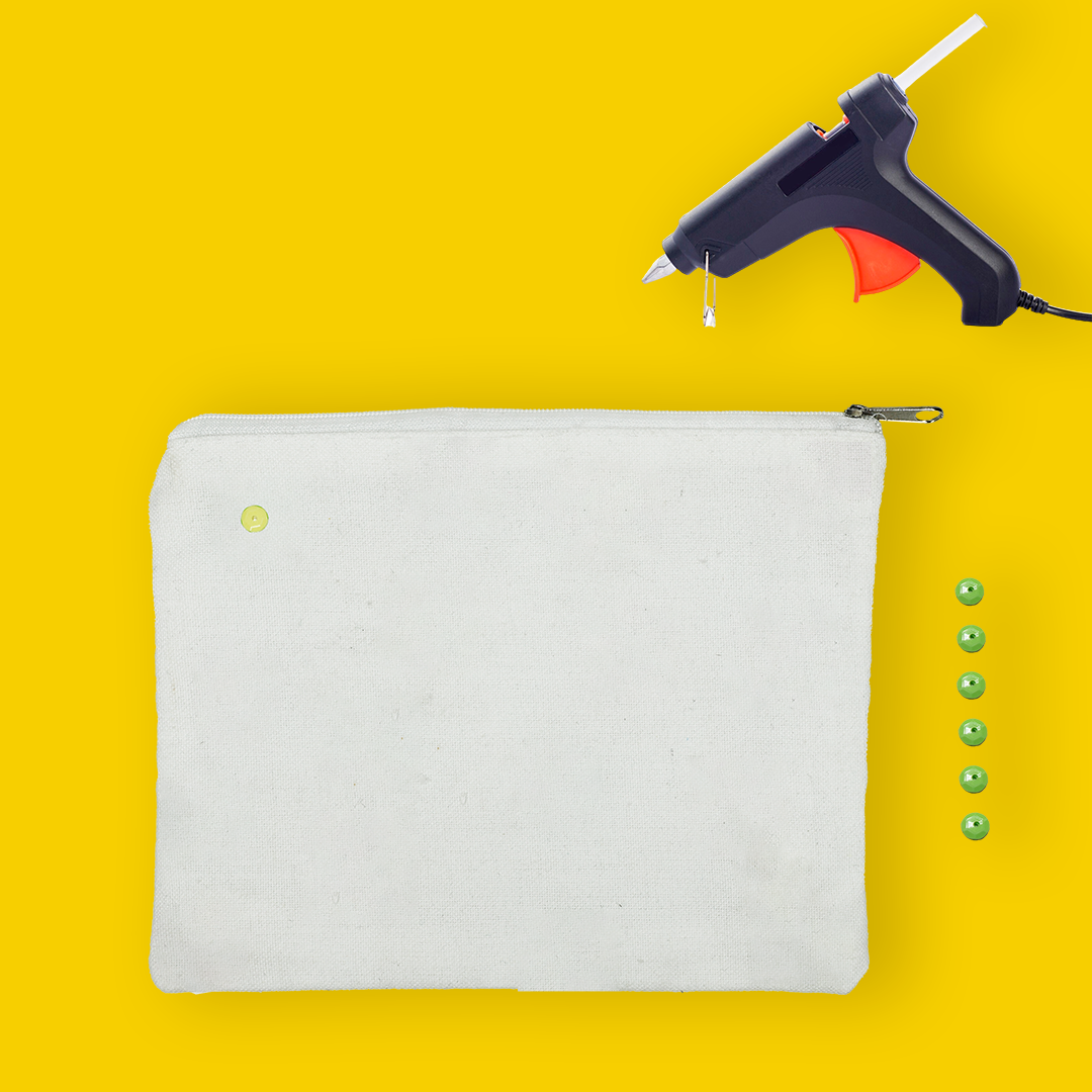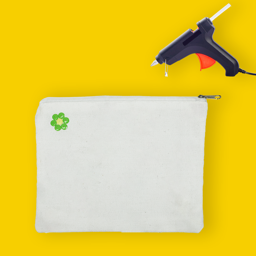 - Je commence par coller, à l’aide d’un pistolet à colle, un sequin jaune pastel sur ma trousse.