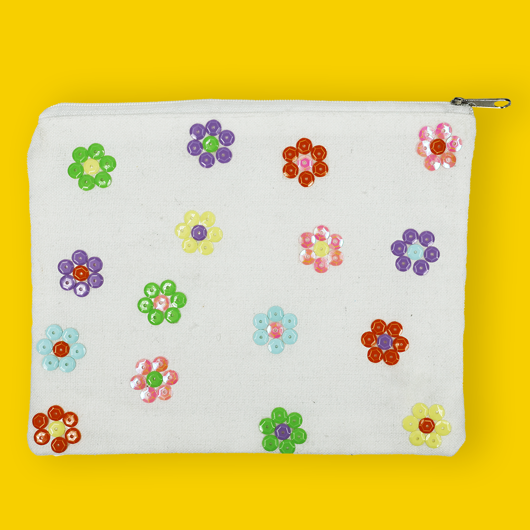 Un DIY facile et scintillant pour créer une adorable trousse fleurie aux couleurs pastel.