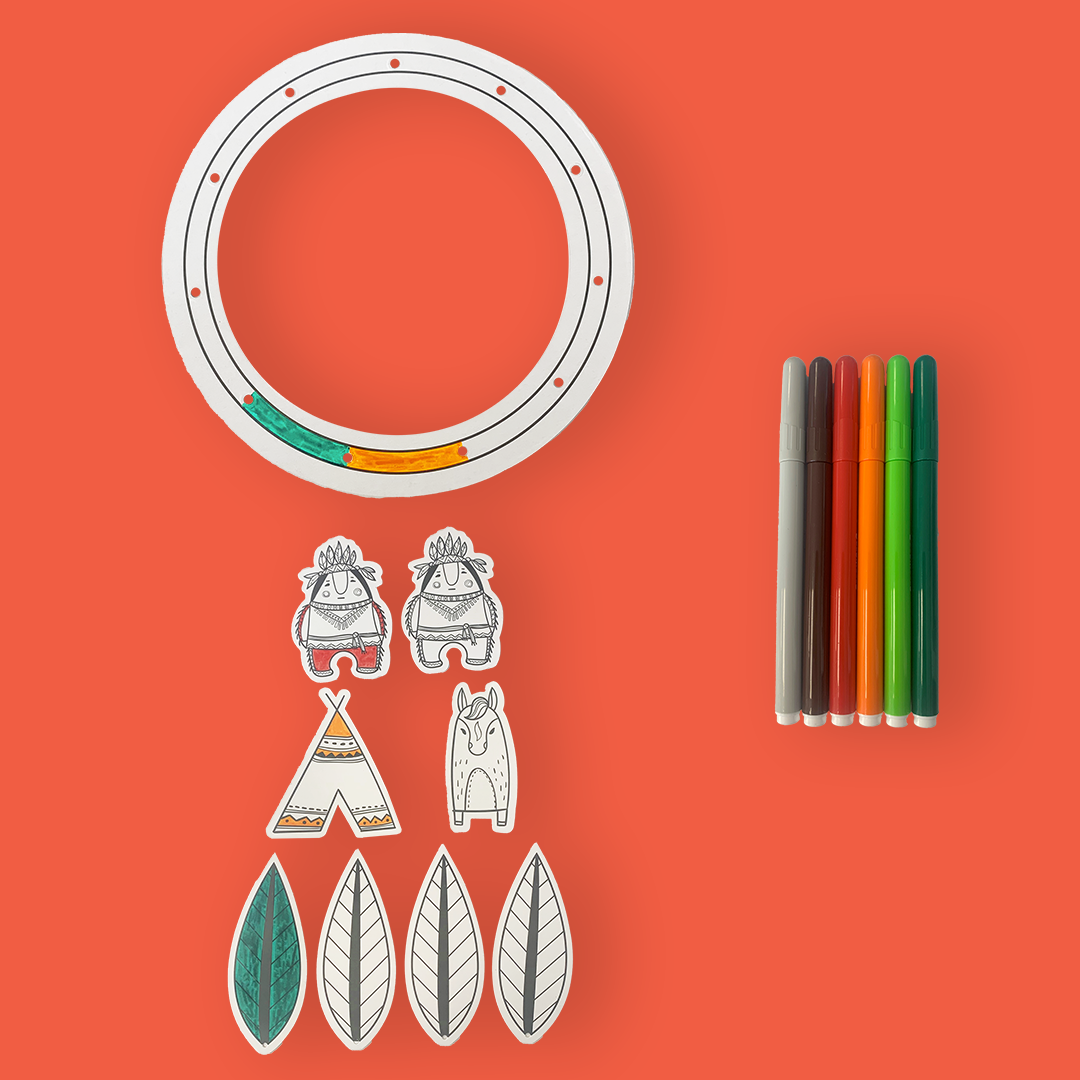 - Je commence par colorier les motifs (plume, indien, tipi et cheval) ainsi que le cercle.
