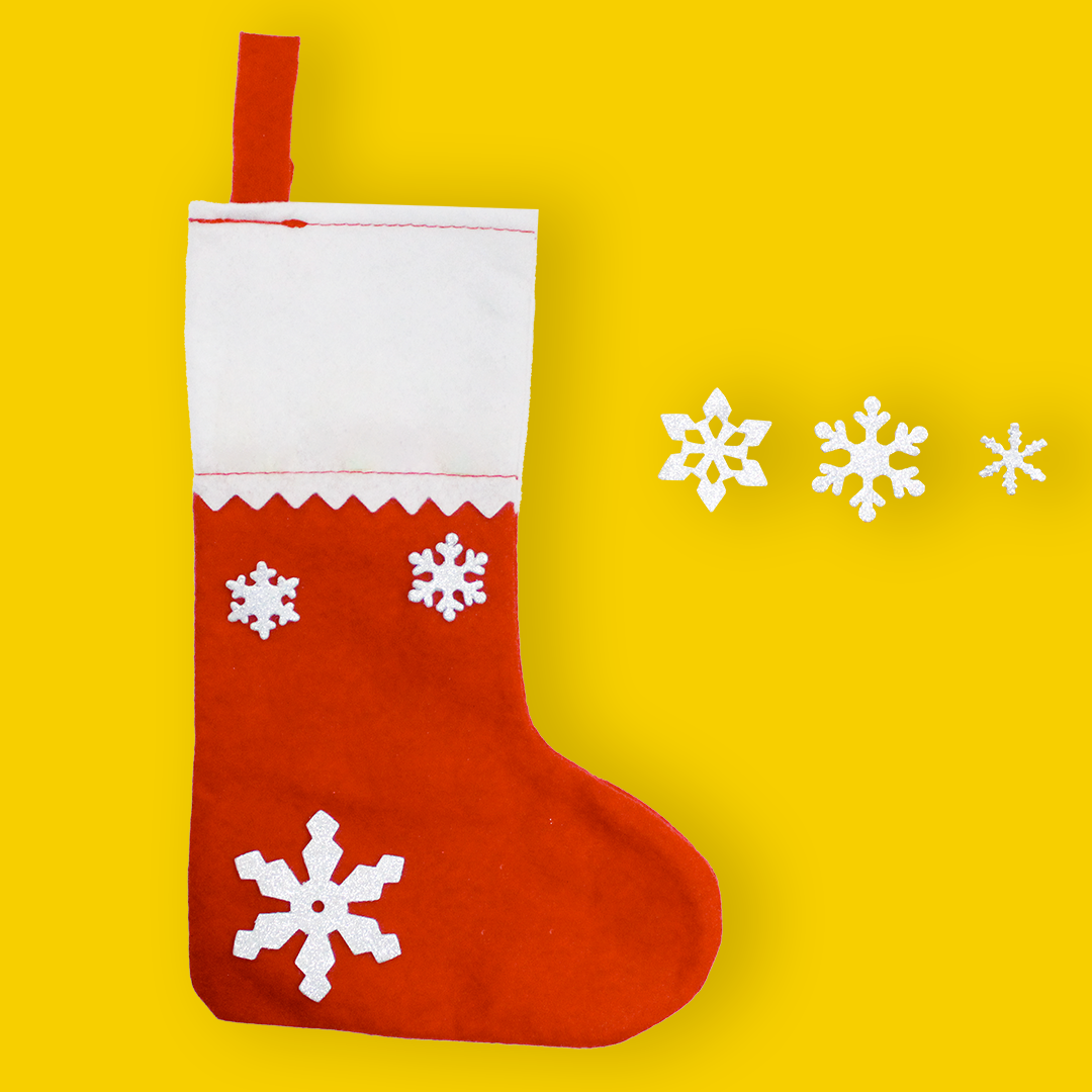- Je colle mes formes en mousse pailletée FLOCONS DE NEIGE sur la chaussette de Noël.