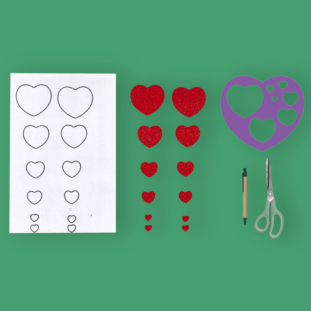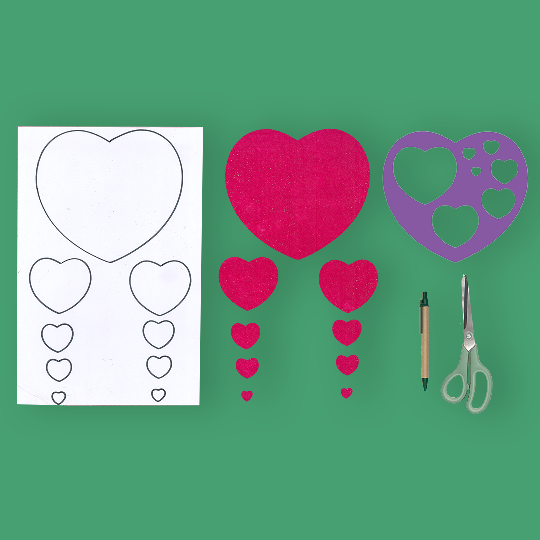 - Je trace des cœurs avec mes pochoirs FORMES GÉOMÉTRIQUES sur ma feutrine adhésive rouge que je découpe.