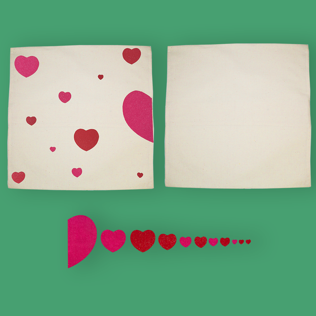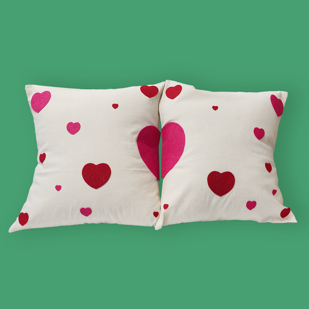 - Je découpe le grand cœur en deux, fixe chaque moitié en miroir sur mes deux housses de coussin, puis colle les autres cœurs de façon aléatoire.