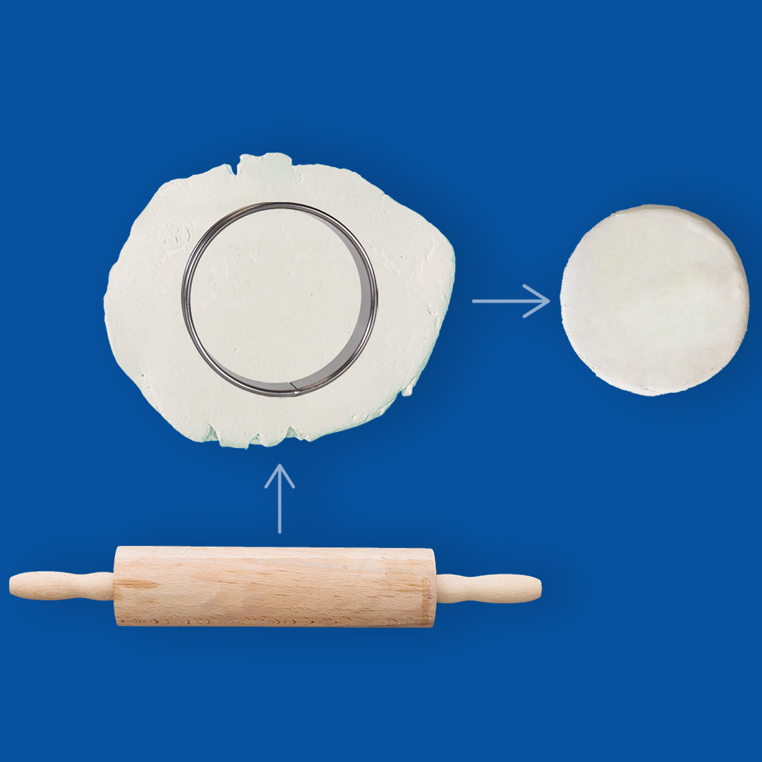 - Je commence par aplatir une boule de PATATROU à l’aide d’un rouleau, jusqu’à l’épaisseur souhaitée. À l’aide d’un emporte-pièce ou d’un bol, je découpe un cercle dans la pâte : ce sera la base de ma rondelle de fruit.