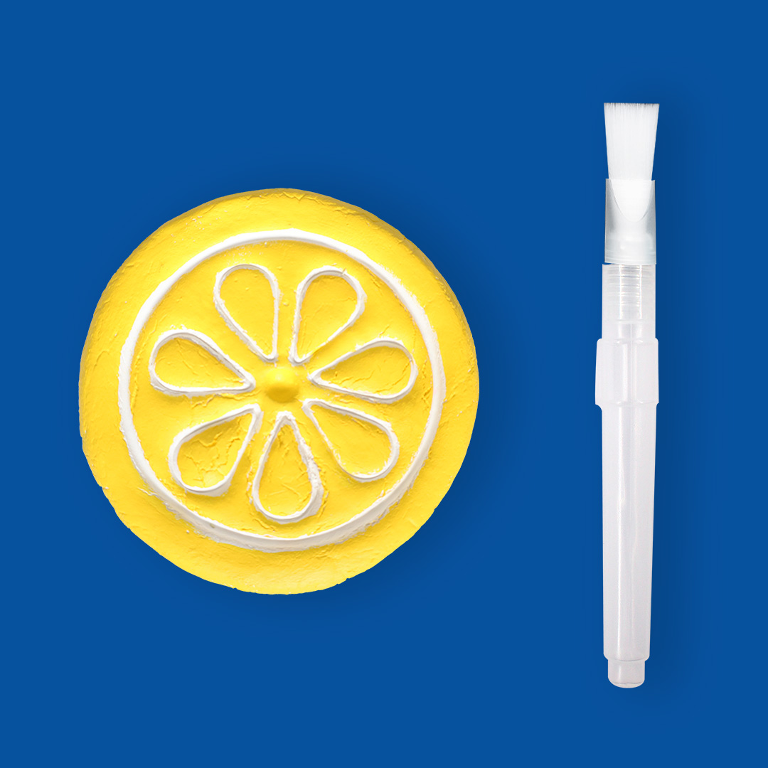 - Une fois la pâte sèche, je passe à l’étape peinture à l’aide de mes pinceaux à réservoir pour peindre une belle rondelle de citron.