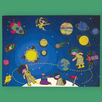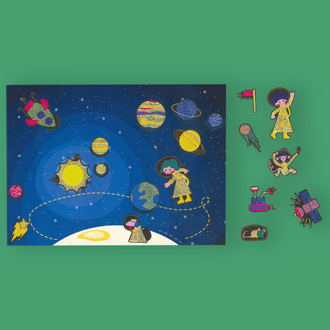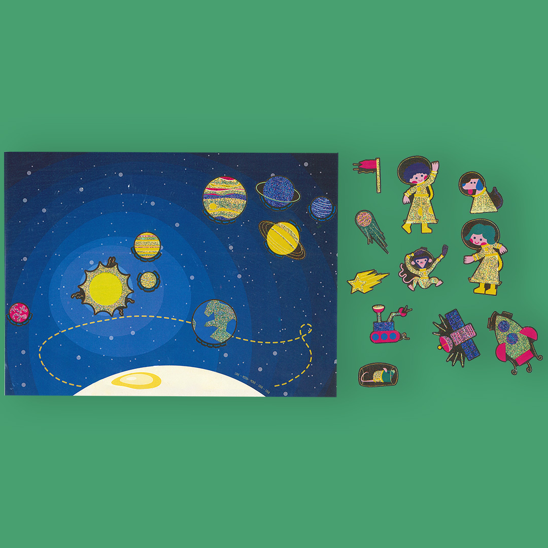 - Je colle les autres éléments de l’espace : astronautes, animaux astronautes, astéroïdes, étoile filante, robot, drapeau, satellite, fusée.
