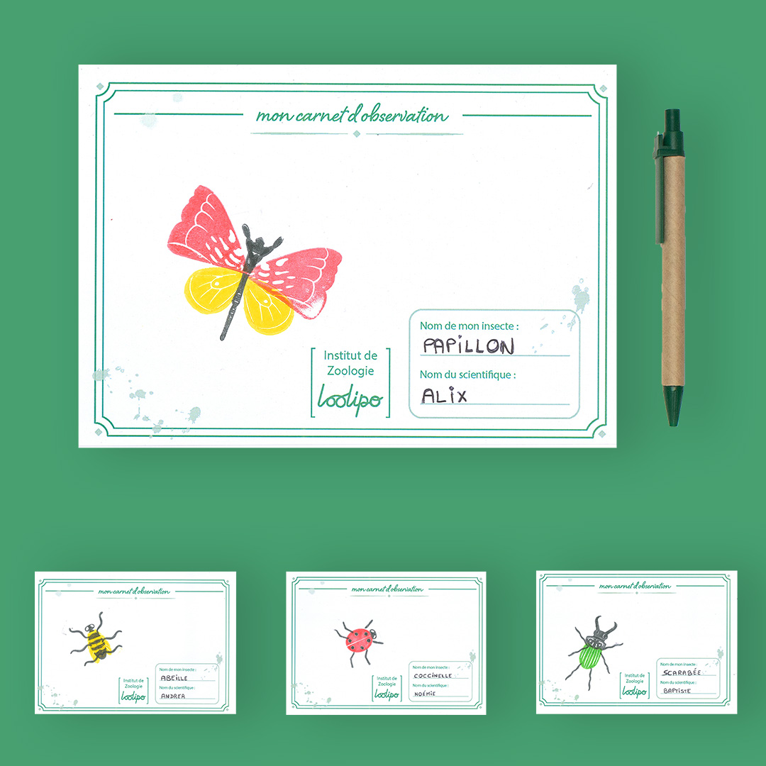 - J’utilise les tampons et encreurs du kit pour reconstituer des insectes existants tels que le papillon, l’abeille, la coccinelle ou encore le scarabée.