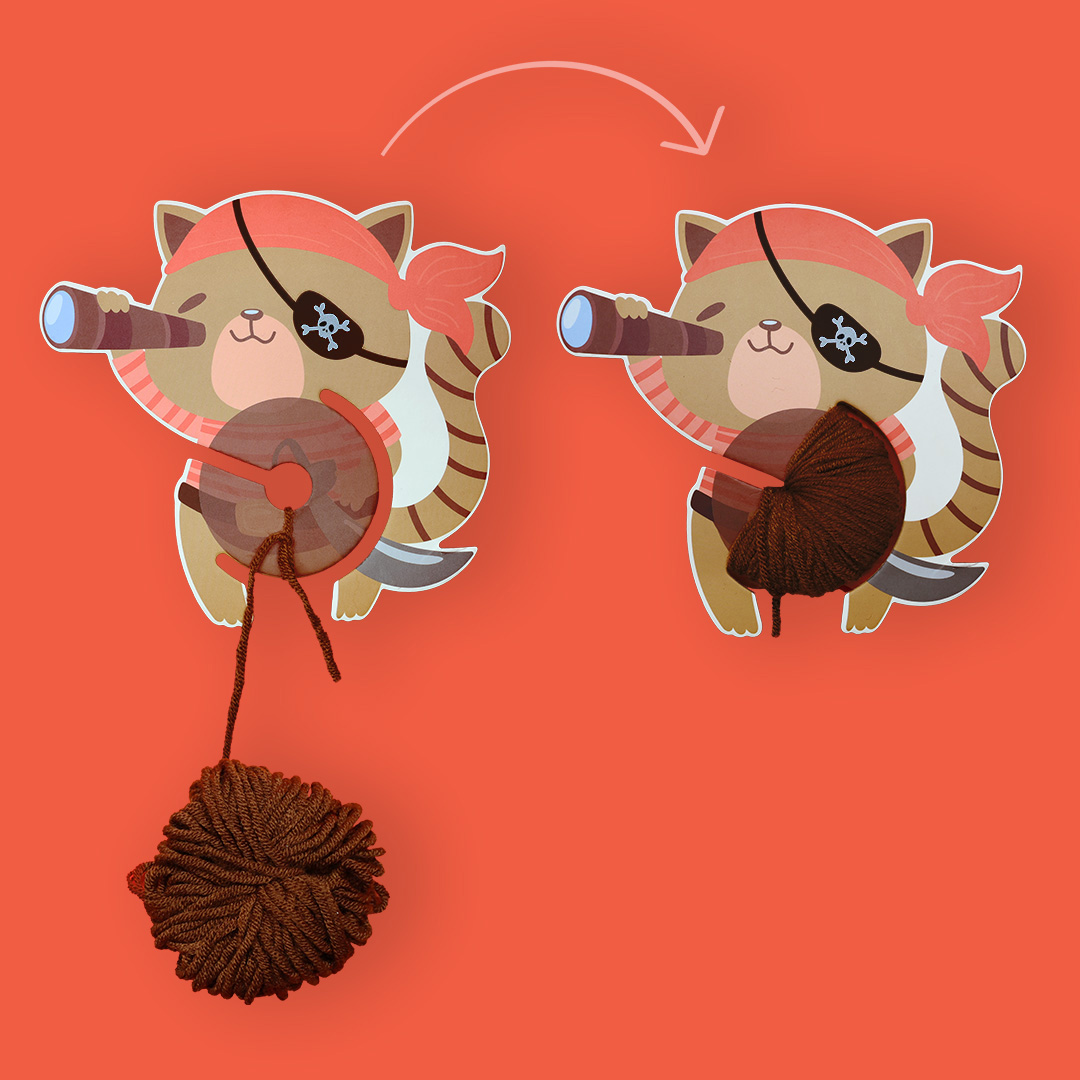 - Je fais un nœud avec l’extrémité de mon fil de laine marron, à l’endroit prévu pour former le pompon, puis j’enroule soigneusement tout le fil autour du ventre du pirate.