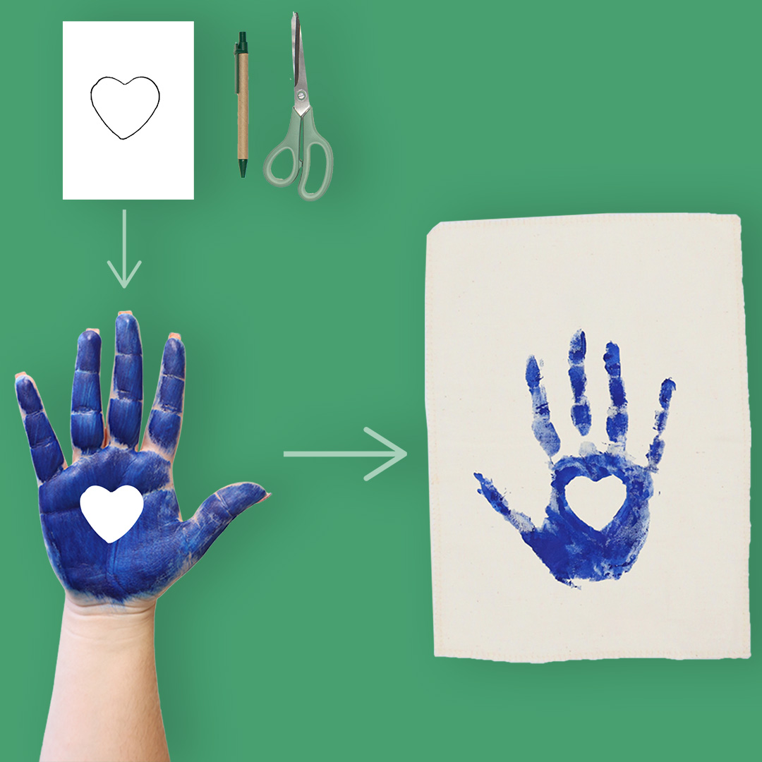 - Je dessine, puis je découpe un cœur dans une feuille que je place au centre de ma paume, puis je tamponne ma main sur le coupon de coton.