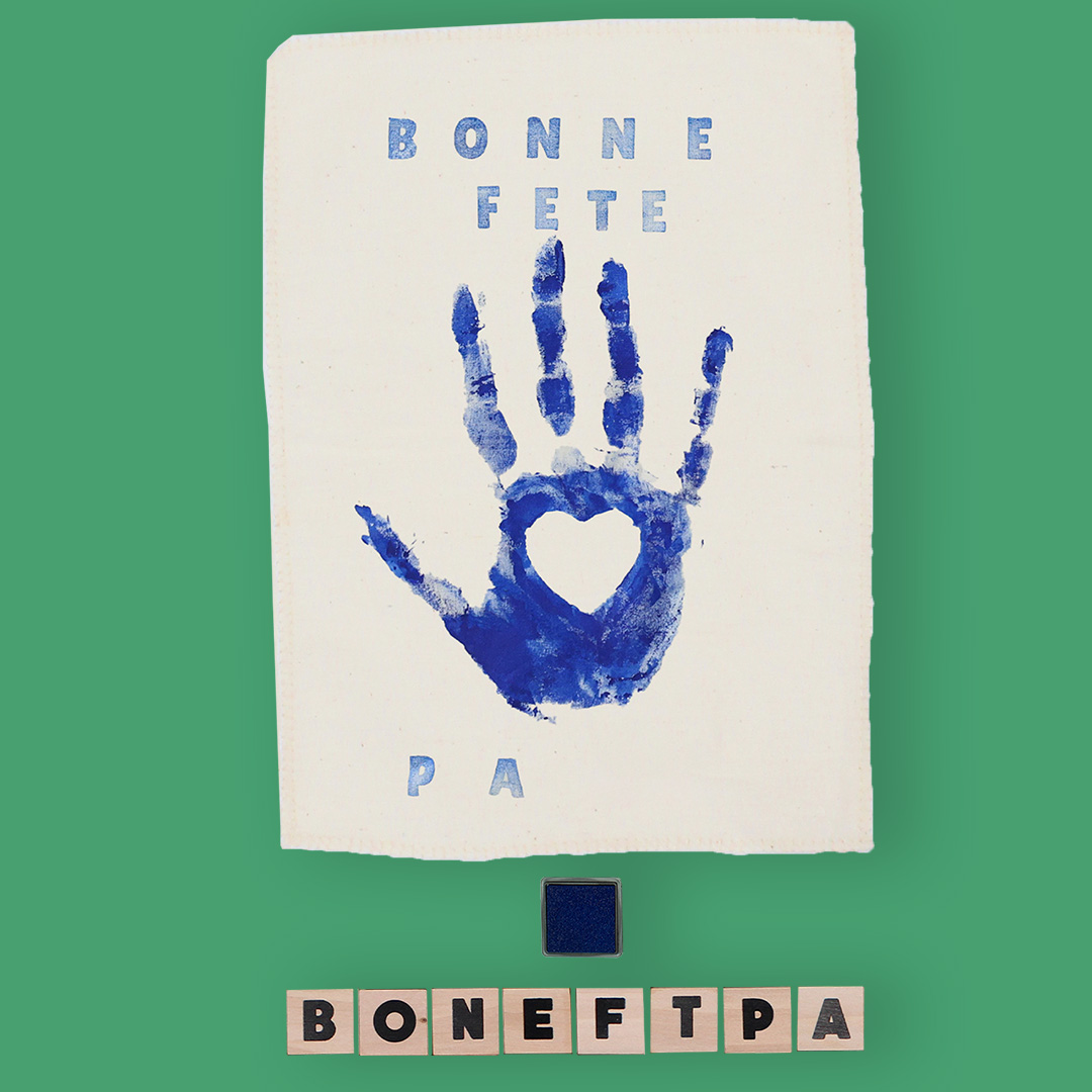 - À l’aide de mes tampons en bois et de mon mini encreur digital bleu, je tamponne le message “BONNE FÊTE PAPA”.