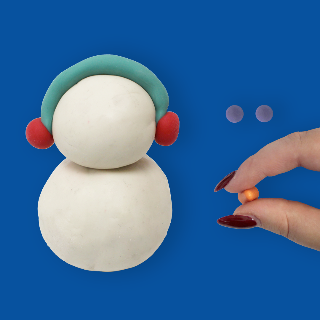 - Je modèle un cache-oreilles avec la PATAQUA verte et rouge, des yeux avec la violette, un nez-carotte avec l’orange et les boutons avec la verte.