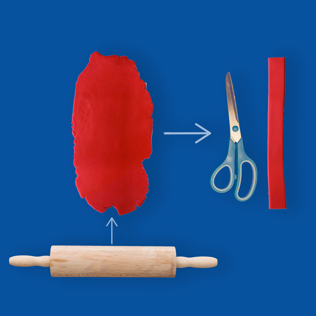 - Pour l'écharpe, j'aplatis la PATAQUA rouge à l’aide d’un rouleau et je découpe une bande.