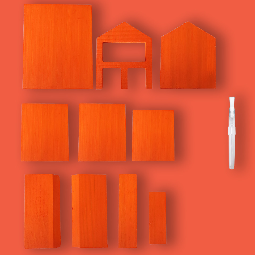 - Je colle les 5 pièces en bois pour former la structure de l’hôtel en utilisant la colle fournie avec le kit, puis je dispose les 2 pièces en bois à l’intérieur de l’hôtel pour créer les compartiments.