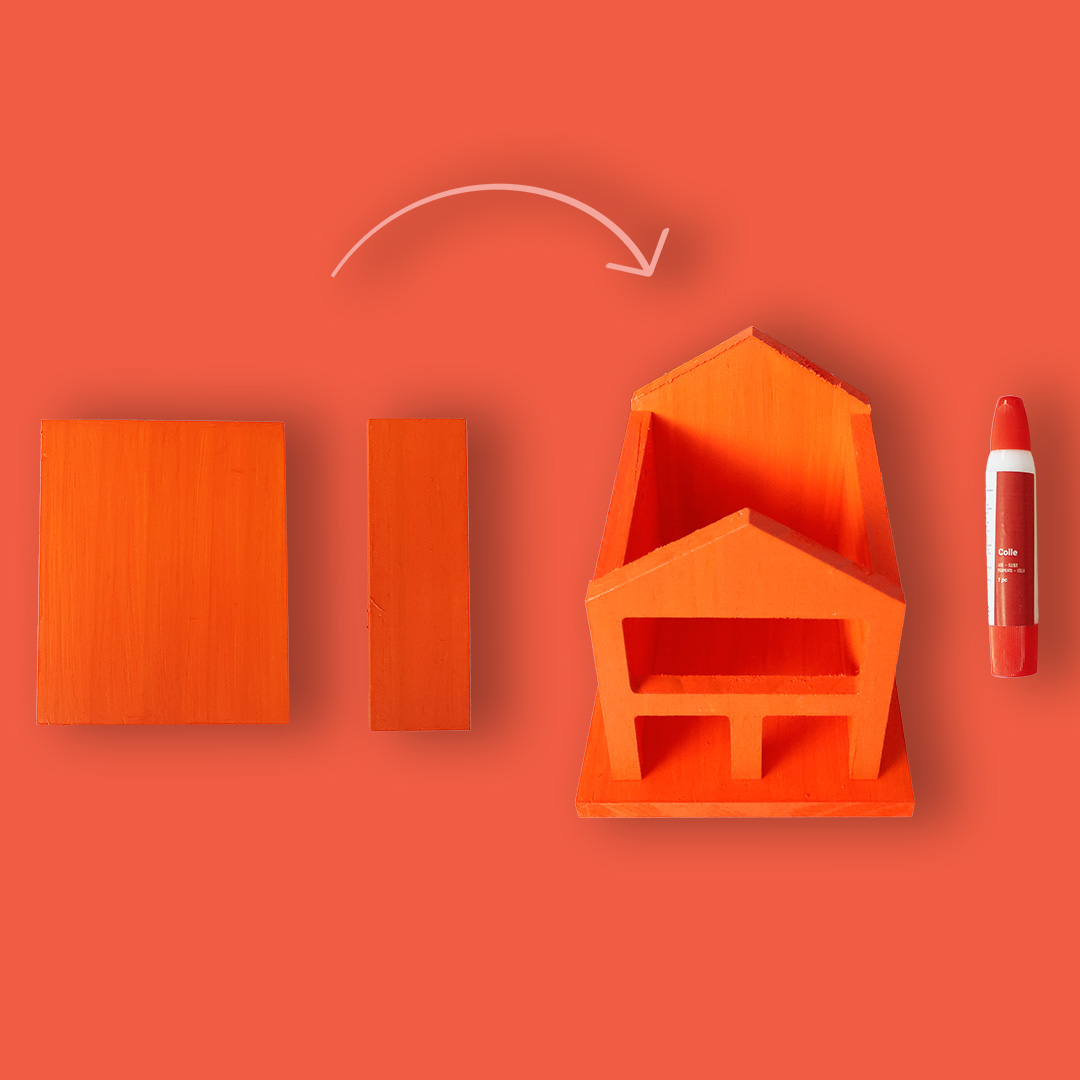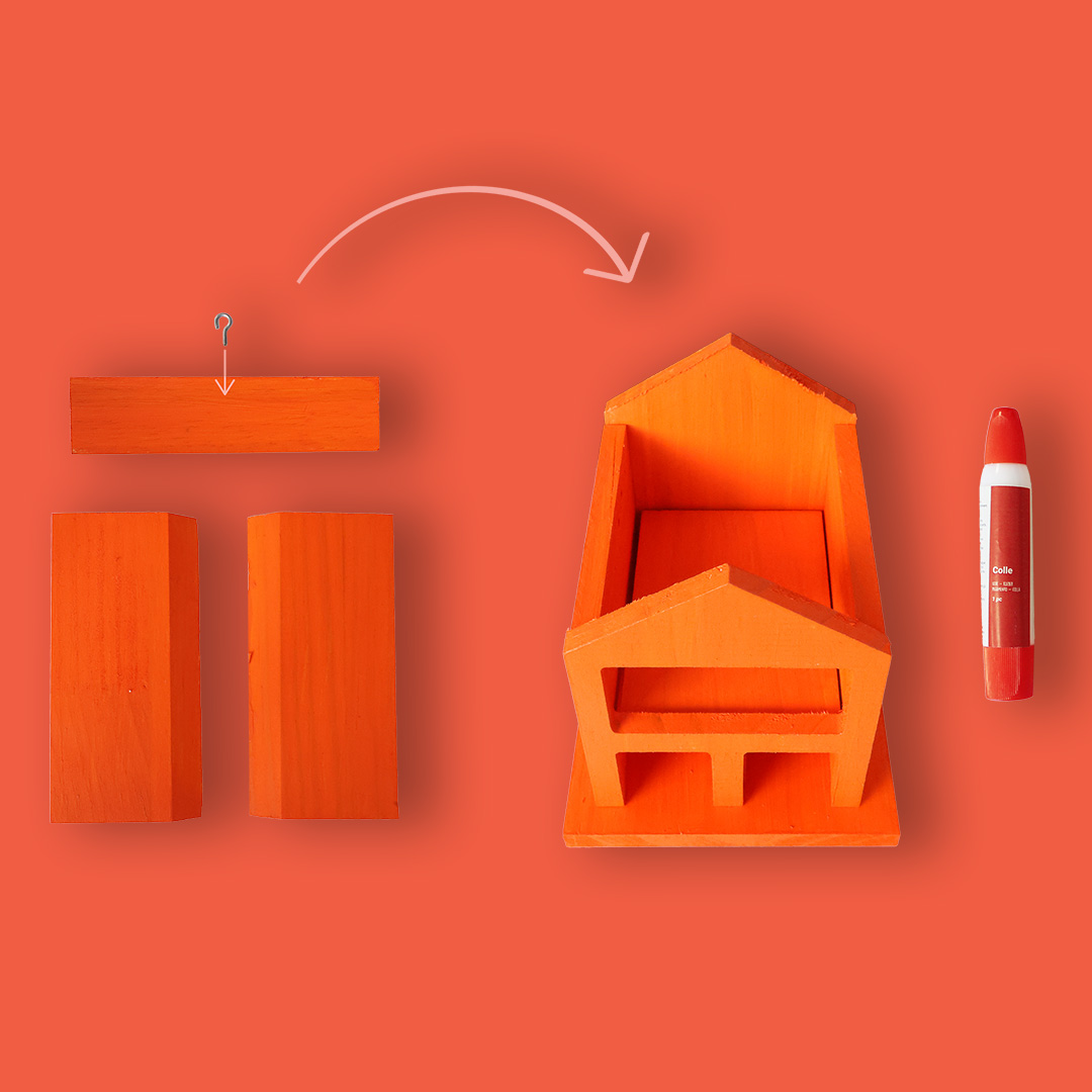 - Je colle les 3 dernières pièces en bois pour former le toit de l’hôtel et je visse le crochet à l’endroit prévu.