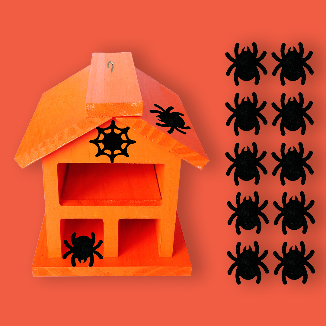 - Enfin, je le décore avec mes gommettes en feutrine Halloween en forme d’araignées et de toiles d’araignée.