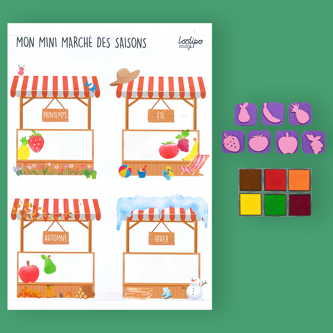 - À l’aide de mes mini tampons mousse et de mes mini encreurs digitaux adaptés à leur taille, je tamponne les bons fruits dans la saison qui leur correspond.