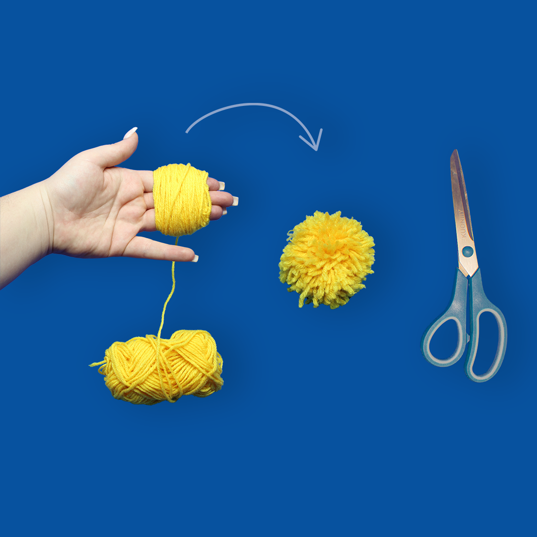 - J'enroule ma pelote autour de ma main, avec un fil supplémentaire je fais un nœud au centre et je coupe les boucles de fil de chaque côté du nœud, pour obtenir un pompon bien rond et uniforme.