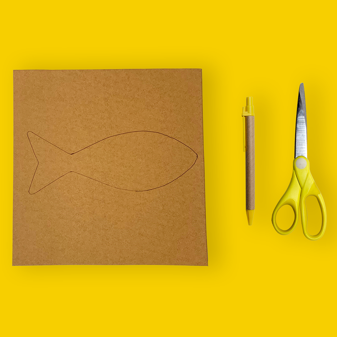 - Je commence par dessiner mon poisson d’avril sur ma feuille de cuir végétal, puis je le découpe.
