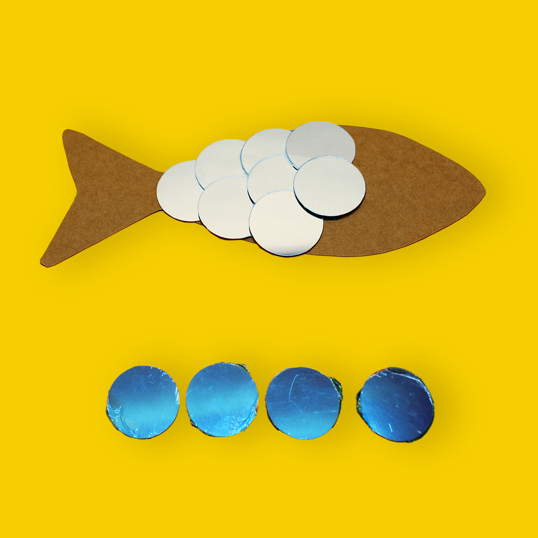 - J'utilise ensuite mon papier miroir adhésif pour dessiner et découper les écailles de mon poisson.